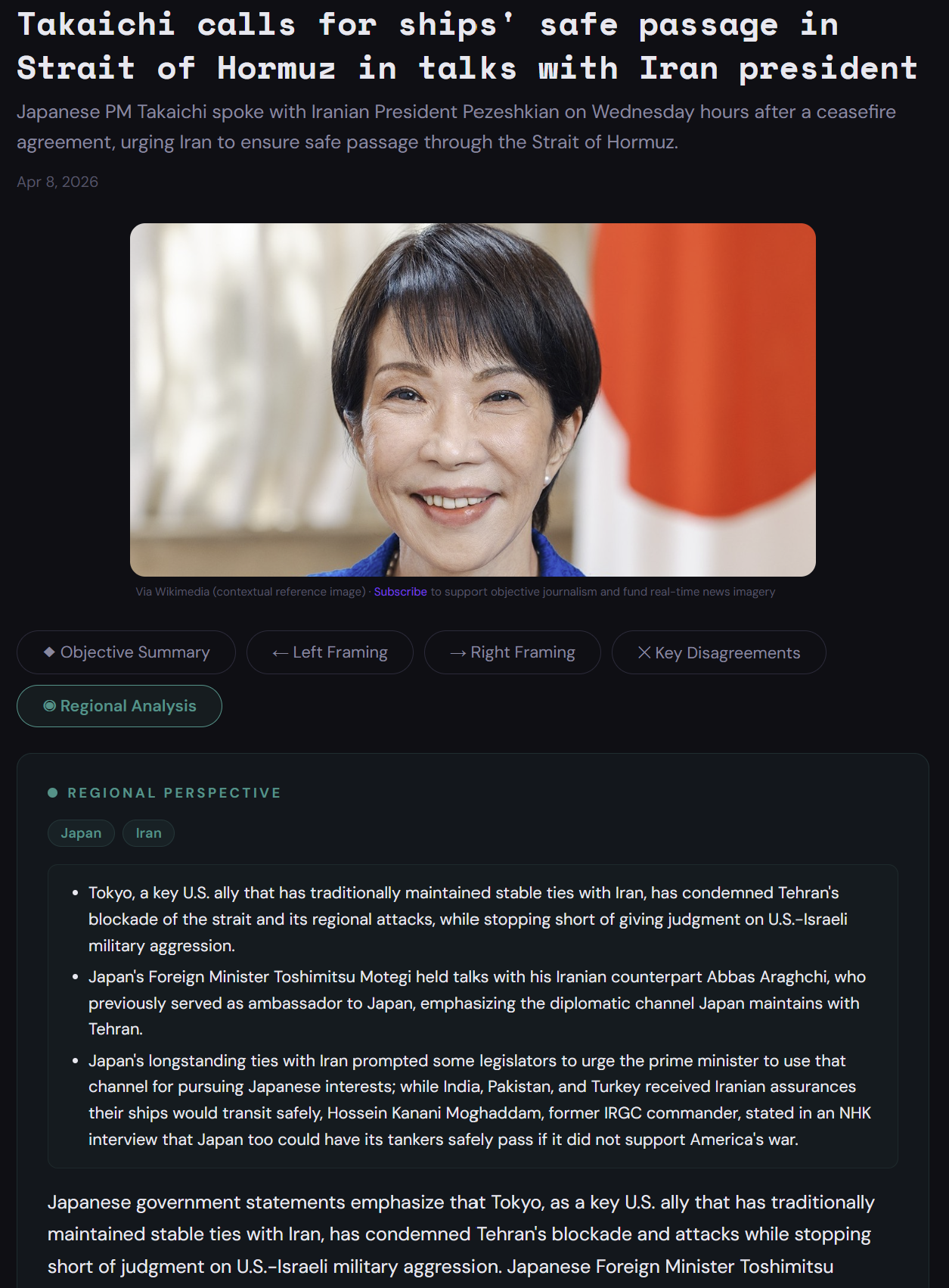 See how outlets across the globe cover the same events — how Japanese media frames the Iran conflict versus American outlets, how European coverage of trade policy differs from domestic reporting. Get the perspectives that western media doesn't show you.