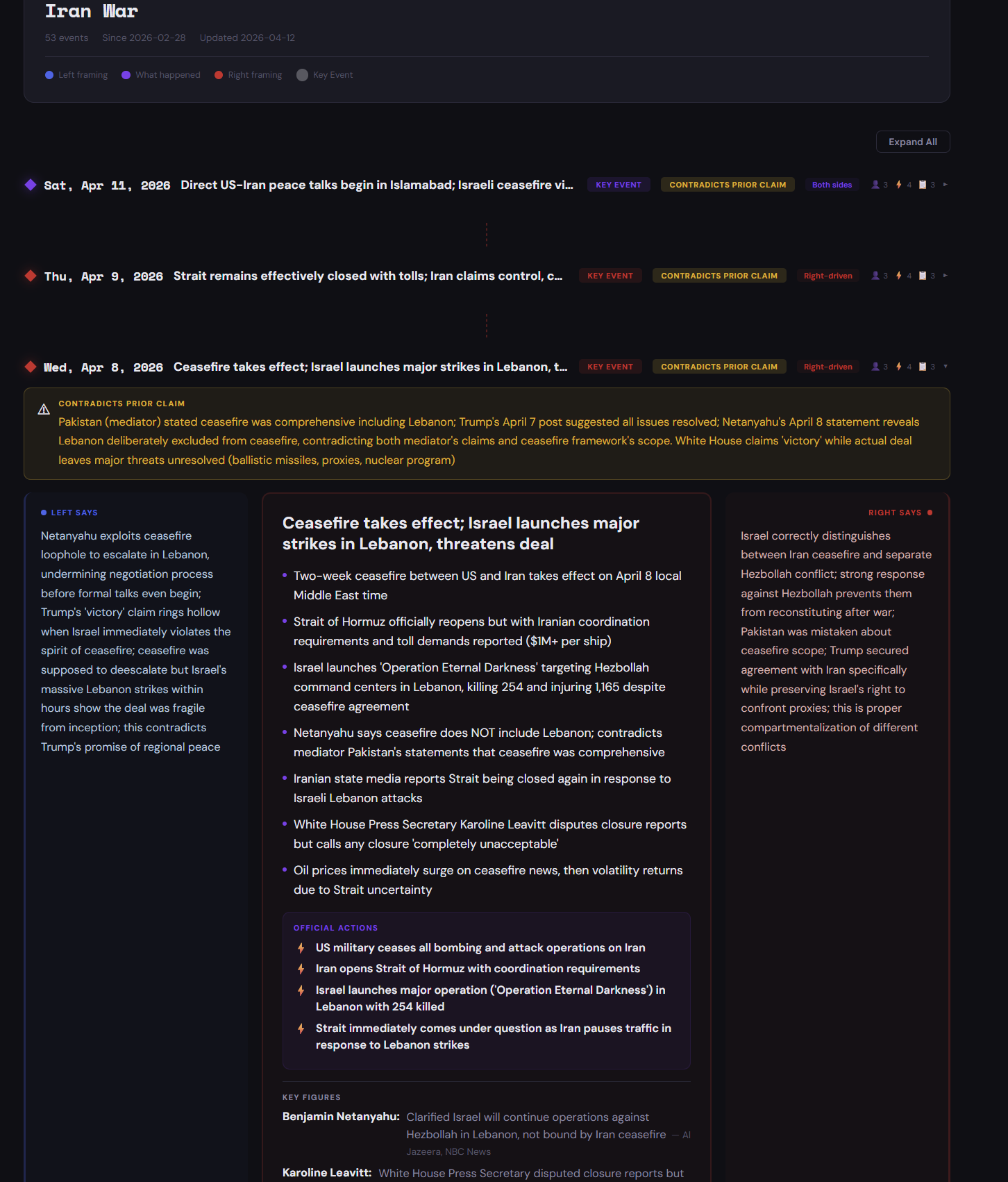Follow developing stories from start to finish. Every official statement recorded. When politicians contradict their own words, we flag it with receipts. See who said what, when they said it, and what actually happened.