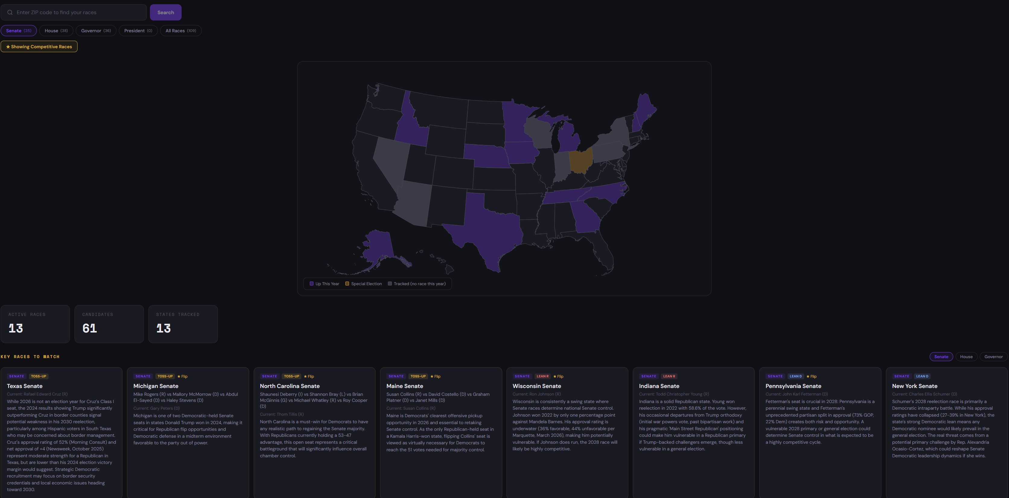 Dive into the races that matter — from competitive Senate battles shaping national policy down to the local candidates who impact your daily life. Interactive maps, candidate positions, voting records, and real coverage from local and national outlets.